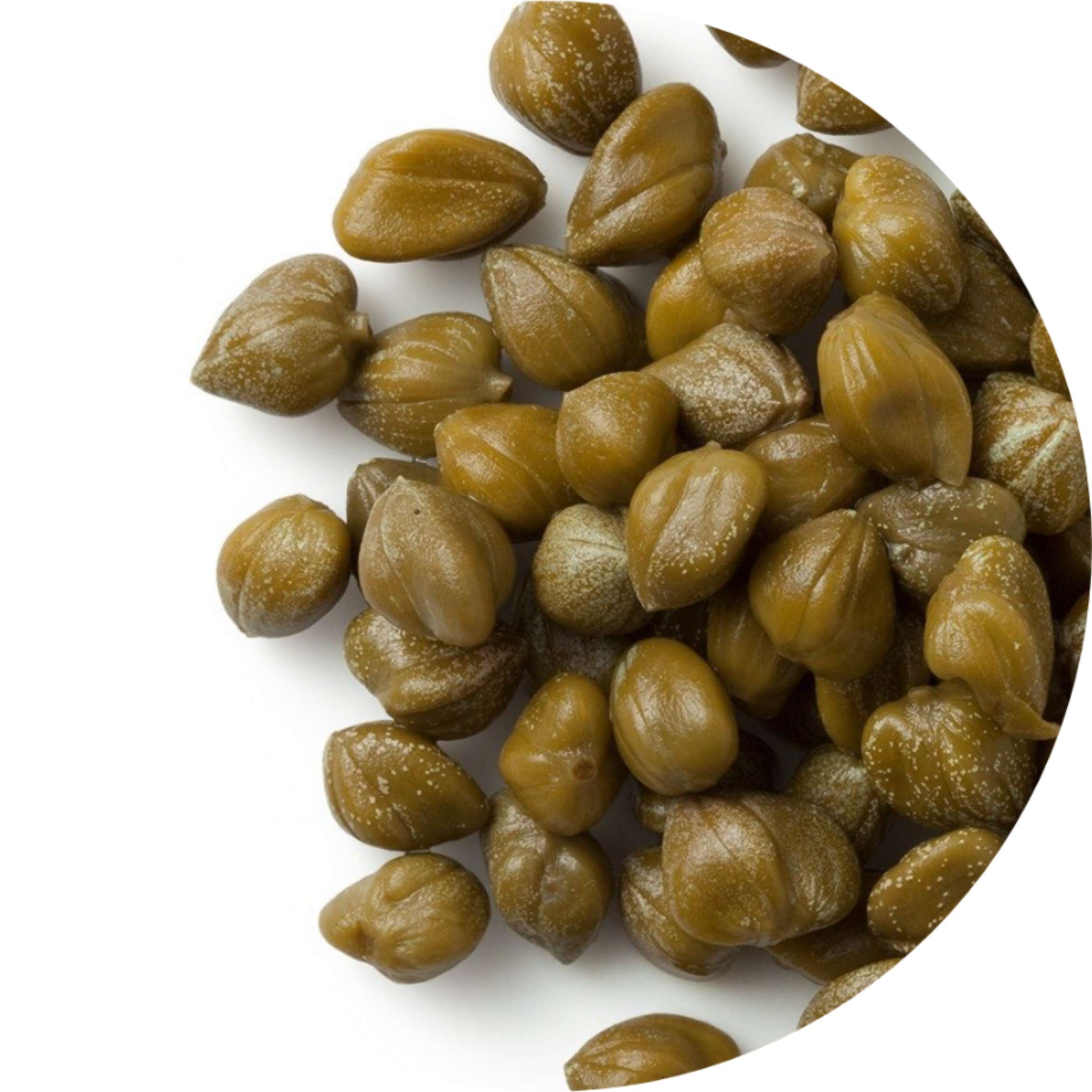 Las Alcaparras son los capullos florales inmaduros del arbusto Capparis spinosa, recolectados a mano antes de que florezcan. Su característica distintiva es un sabor intenso, salado y ligeramente picante, derivado de su proceso de conservación. Se encurten tradicionalmente en una solución de vinagre y salmuera, lo que les confiere su acidez y firmeza.En la gastronomía internacional y, notablemente, en el adorno de la hallaca, las alcaparras funcionan como un poderoso contrapunto de sabor. Aportan una nota salina y ácida que contrasta y equilibra la riqueza de las carnes y el dulzor del guiso, elevando la complejidad de cualquier plato. Son pequeñas pero altamente concentradas en sabor.