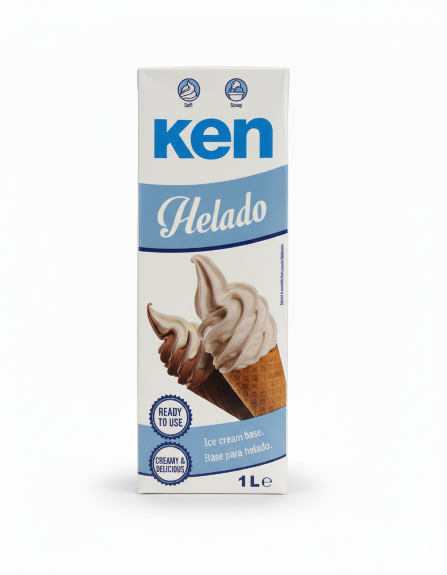 Descripción del Producto: KEN HELADO SOFT es una base líquida UHT (Ultra High Temperature) lista para usar, especialmente formulada para la elaboración de helados tipo soft (o helado suave) en máquinas de heladería profesional. Este producto simplifica el proceso de producción, ya que se vierte directamente en la máquina sin necesidad de mezclas previas, ofreciendo la máxima higiene y un control de costes óptimo. Garantiza un helado con una textura suave, cremosa, sedosa y estable, además de un sabor lácteo de gran calidad, ideal para heladerías, cafeterías y negocios de restauración que buscan eficiencia y consistencia.Información Nutricional (Valores aproximados por 100g): La composición puede variar ligeramente, pero se basa en los componentes de las bases Soft de la marca.Proteínas: Aprox. 3 gHidratos de Carbono totales: Aprox. 21 gDe los cuales azúcares: Aprox. 21 gGrasas: Aprox. 3.5%Valor energético: No disponible detallado en la ficha técnica genérica, pero una base Soft similar ronda las 120-150 kcal.Ingredientes (Basado en la ficha técnica de la marca para la línea Soft): Leche desnatada, nata, azúcar, leche desnatada en polvo, jarabe de glucosa y fructosa, emulgente (E-471), estabilizantes (E-466, E-412, carragenano, E-401, E-410). Contiene leche y sus derivados (incluida la lactosa).Modo de Uso:Refrigeración: Asegúrese de que el producto esté bien frío antes de usar (temperatura entre 0 °C y 5 °C).Preparación: Agite bien el envase antes de abrir.Uso en máquina: Vierta directamente el contenido en el depósito de la máquina de helado soft, siguiendo las instrucciones específicas del equipo.Almacenamiento: Mantener refrigerado entre 0 °C y 5 °C. El formato UHT permite un almacenamiento prolongado antes de abrir. Una vez abierto, el envase debe consumirse en un plazo máximo de 3 días.