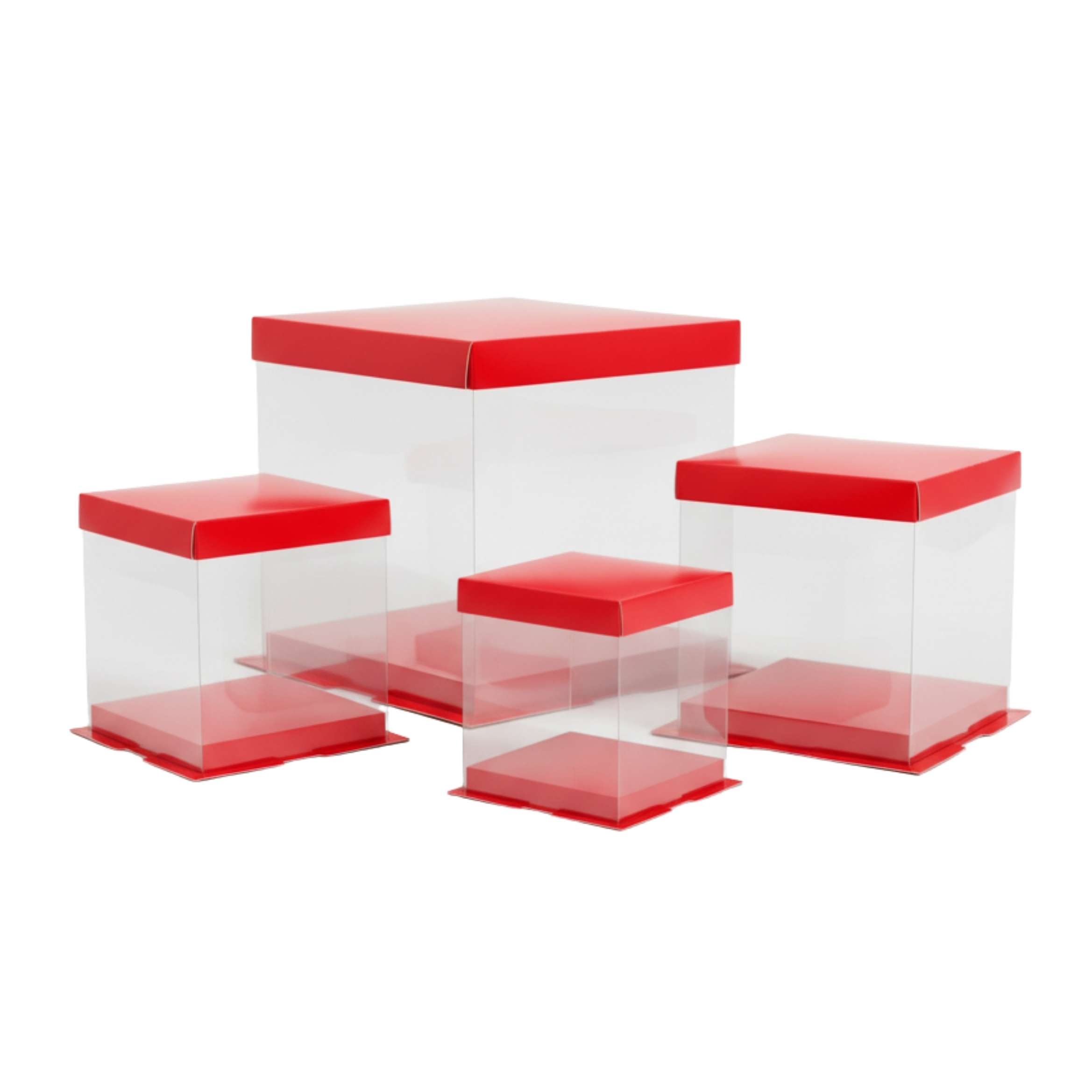 Las Cajas de Acetato Transparente con Base y Tapa Roja ofrece una solución de packaging versátil y visualmente impactante, ideal para la presentación de postres, regalos, souvenirs o arreglos. La estructura principal de la caja, fabricada en acetato de alta transparencia (PET o PVC de grado alimenticio), garantiza que el producto interior sea el protagonista, ofreciendo una vista panorámica sin igual.El contraste que proporciona la base y la tapa de color rojo vibrante (generalmente cartón rígido forrado o cartulina de alto gramaje) añade un toque de elegancia y festividad, haciéndolas perfectas para ocasiones especiales como San Valentín, Navidad, cumpleaños o aniversarios. Al estar disponibles en varios tamaños y alturas, este set permite acomodar desde un solo cupcake, una rosa, bombones, hasta tortas de mediana altura, mug cakes o figuras de repostería elaboradas.