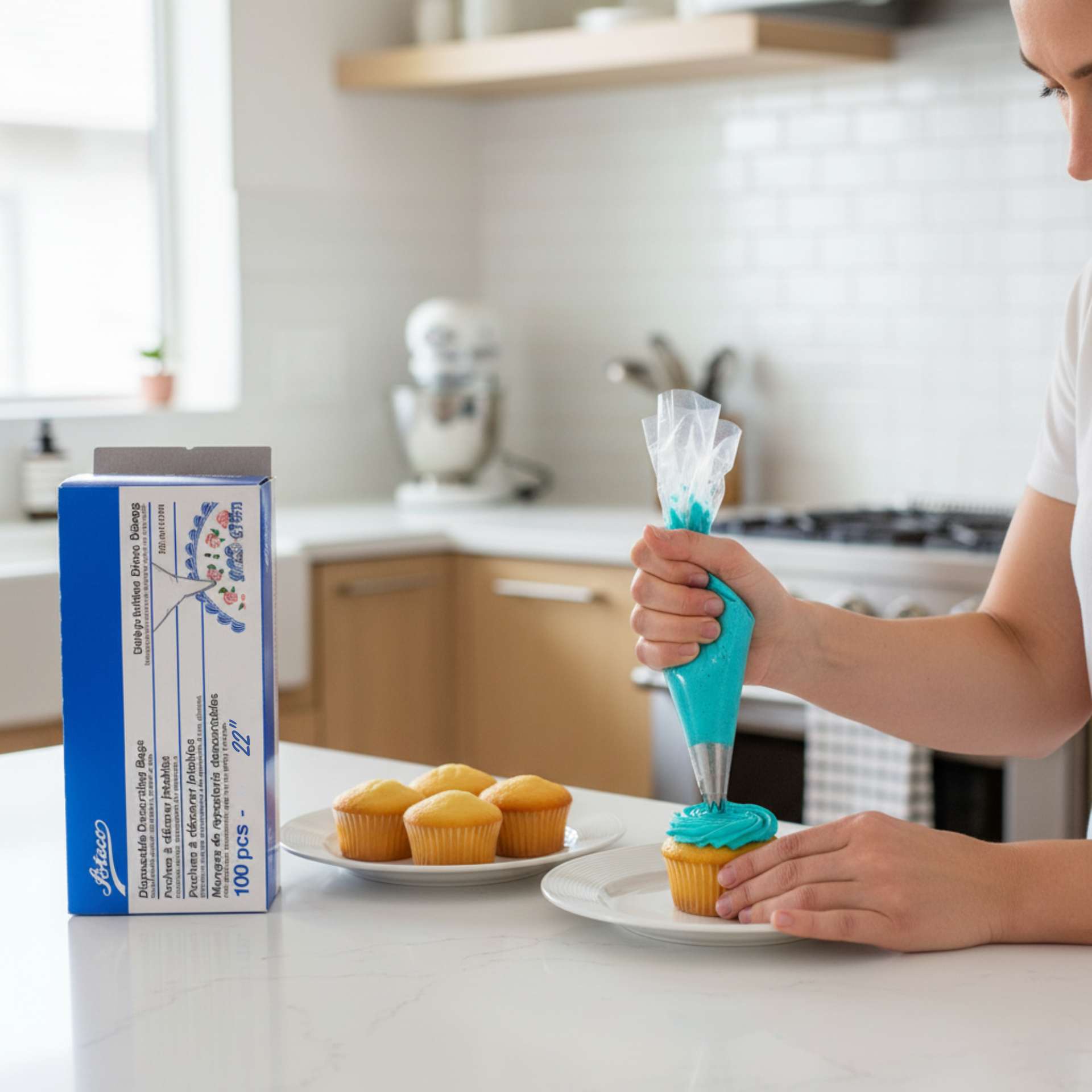 Estas mangas pasteleras desechables de 22 pulgadas de Ateco son la herramienta ideal para cualquier profesional de la repostería. Confeccionadas con una resistente película de polietileno, estas mangas son higiénicas, seguras y fáciles de usar, perfectas para decorar con crema de mantequilla, glaseados, cremas de relleno y mucho más.Diseñadas para un rendimiento óptimo, estas mangas cuentan con una superficie texturizada que proporciona un agarre seguro y antideslizante, mientras que la punta lisa asegura que la manga no se estire al colocar el acoplador. El diseño de un solo uso te permite ahorrar tiempo en la limpieza, para que te enfoques en lo que realmente importa: crear hermosas y deliciosas obras de arte.El paquete incluye 100 unidades, asegurando un suministro duradero para tu negocio o para tus proyectos de repostería más exigentes. Simplifica tu trabajo y mantén la higiene en tu cocina con estas mangas pasteleras de alta calidad.