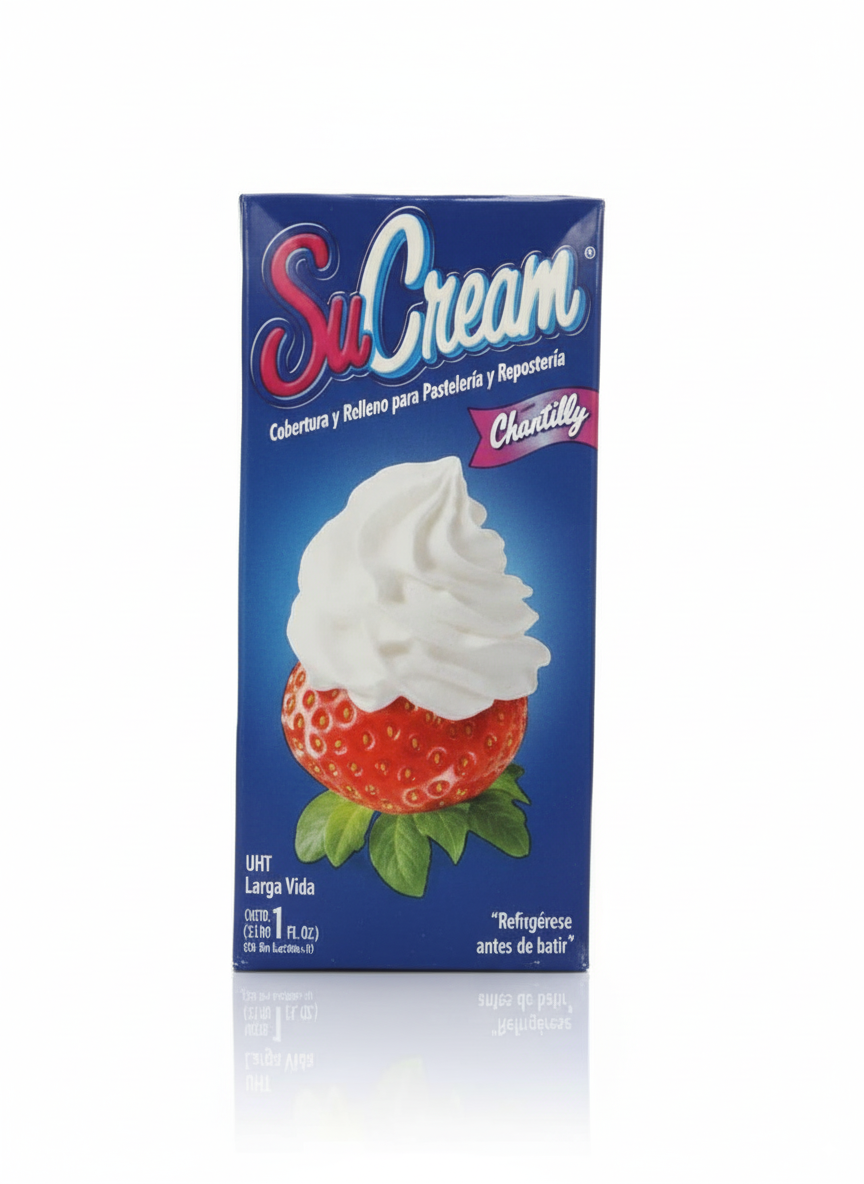 La Chantilly Sucream es una crema batida vegetal UHT de alto desempeño, ideal para profesionales que buscan un resultado consistente y de gran calidad. Esta crema está pre-endulzada y lista para batir, ofreciendo un excelente volumen y una blancura intensa perfecta para el arte de la repostería. Su principal ventaja es su máxima estabilidad, que permite que las decoraciones se mantengan firmes por más tiempo, siendo perfecta para la cobertura, el relleno y el decorado de tortas, postres helados y bebidas gourmet.IngredientesAgua, aceite vegetal de palmiste hidrogenado, azúcar, proteína de leche, emulsificantes, estabilizantes, saborizantes y colorantes.