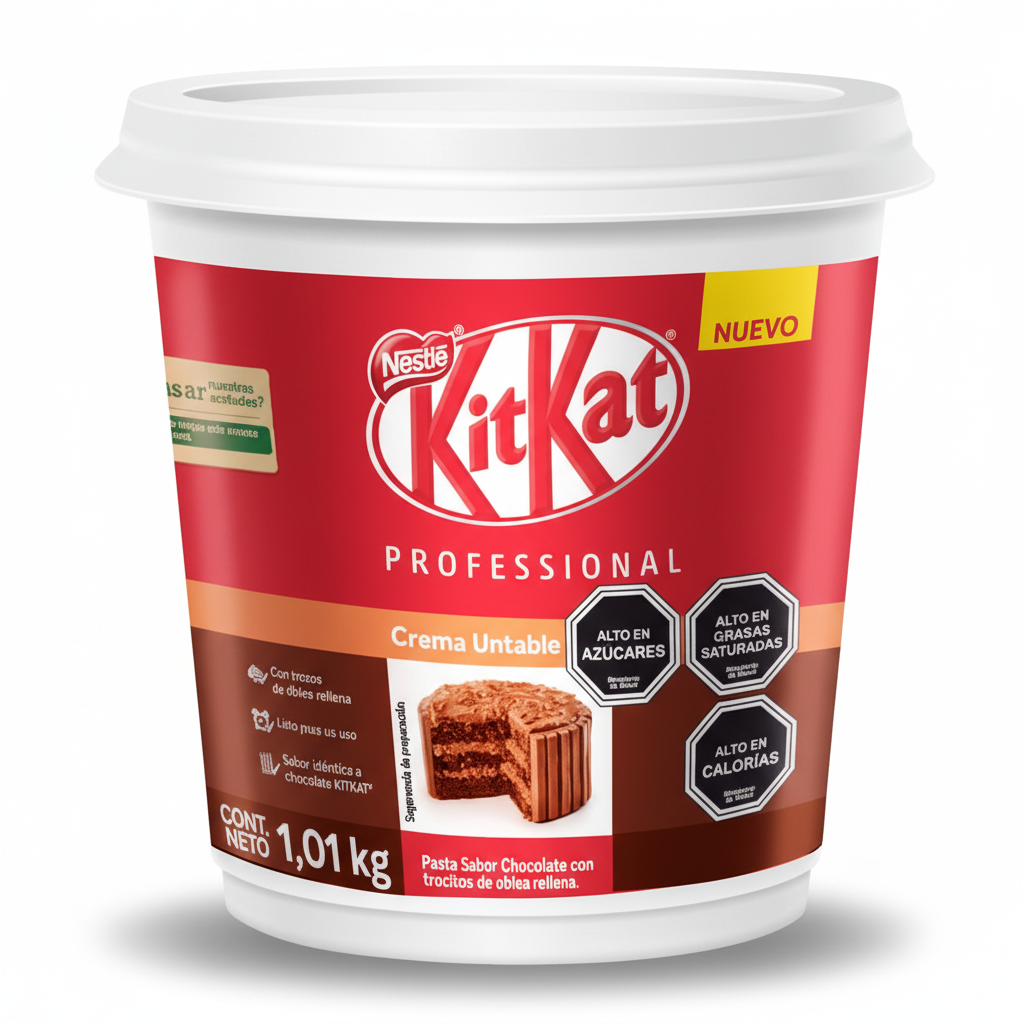 Lleva el icónico sabor del chocolate y la galleta crujiente de KitKat a tus postres con esta versátil crema untable. Diseñada para chefs y amantes de la repostería, su textura suave es ideal para usarla como relleno de brownies, tortas, y galletas, o como una deliciosa cobertura que se mantiene estable. Esta crema te permite incorporar el sabor único de KitKat de forma profesional y sencilla. Es la solución perfecta para dar un toque diferenciador a tus creaciones. Disponible en presentaciones de 1 kg, 500 g y 250 g, se adapta a todas las necesidades, desde grandes producciones hasta proyectos caseros.Ingredientes:Azúcar, aceites vegetales (girasol y palma), suero de leche en polvo, galleta wafer, cacao desgrasado en polvo, leche desnatada en polvo, avellana, emulsionante (lecitina de soya), sal y saborizante.Alérgenos: Contiene leche, soya, avellana y gluten. Puede contener trazas de otros frutos secos.Información nutricional (por 100g de producto):Energía: 549 kcalGrasas: 33 gGrasas saturadas: 6.1 gCarbohidratos: 56 gAzúcares: 52 gProteínas: 6.3 gSal: 0.25 g