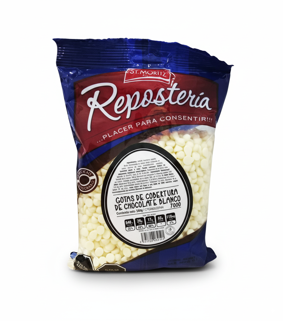 Las Gotas de Cobertura Blanca St. Moritz son el aliado perfecto para dar un acabado suave y brillante a tus postres. Su práctico formato en gotas está diseñado para fundirse de forma rápida y uniforme, lo que la hace ideal para bañar, moldear y crear drips en pasteles y galletas. Esta cobertura blanca es un lienzo en blanco para la creatividad. Su sabor dulce y cremoso es perfecto para usar en cualquier receta de repostería que requiera un sabor y una textura delicada. Es la opción ideal para profesionales y amantes de la repostería que buscan un producto versátil y de excelente rendimiento.Ingredientes:Azúcar, grasa vegetal, suero de leche en polvo, maltodextrina, lecitina de soya (emulsionante) y saborizante artificial (vainillina).Aviso de alérgenos: Contiene leche y soya. Puede contener trazas de maní y/o nueces de árbol.