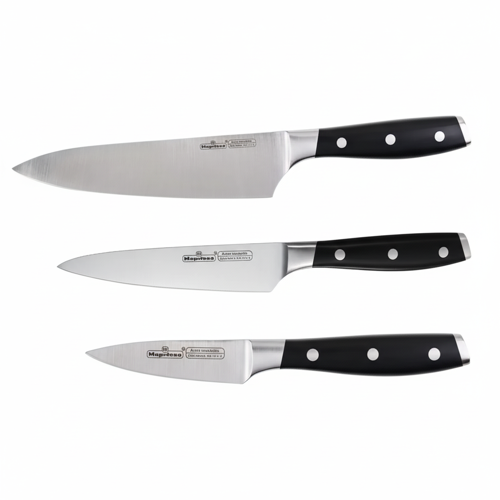 El Juego de 3 Cuchillos Magefesa de la Línea Classic es el set de iniciación perfecto para equipar cualquier cocina con herramientas de corte esenciales, confiables y de alta calidad. Diseñado bajo el estándar de la marca Magefesa, este set ofrece rendimiento y durabilidad en las tres piezas más utilizadas diariamente.Componentes y Materiales de Calidad Profesional:Hoja de Acero Forjado Alto en Carbono: Cada cuchillo cuenta con una hoja de una sola pieza elaborada en acero inoxidable forjado alto en carbono. Esta composición garantiza una resistencia superior, durabilidad prolongada y excelente capacidad para mantener el filo.Alta Dureza (HRC 55+/-2): un rango óptimo que asegura que el filo se conserve por más tiempo y sea fácil de reafilar.Mango Ergonómico: Los mangos están diseñados para una mayor comodidad y manipulación segura, reduciendo la fatiga durante tareas de corte prolongadas.