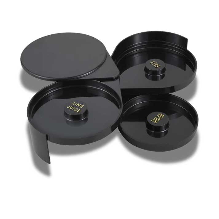 Prepárate para impresionar a tus invitados y crear las margaritas perfectas con el Kit para Hacer Margaritas 3 Niveles de la reconocida marca WINCO. Este completo set es el complemento ideal para cualquier amante de los cócteles, desde el principiante entusiasta hasta el bartender casero experimentado.Con un diseño inteligente y funcional, este kit te permite preparar margaritas de manera profesional y sin esfuerzo. El sistema de tres niveles está diseñado para optimizar el proceso de preparación:Nivel 1 (Sal): El primer compartimento contiene una bandeja para sal de borde ancho, ideal para escarchar el borde de tus copas con sal de una manera uniforme y elegante. Su diseño permite que la sal se adhiera perfectamente sin desbordarse.Nivel 2 (Jugo de Lima/Limón): El segundo nivel es un recipiente con esponja, perfecto para humedecer el borde del vaso con jugo de lima o limón. La esponja asegura una distribución uniforme del jugo, preparando la superficie para que la sal o el azúcar se adhieran de manera impecable.Nivel 3 (Azúcar/Especias): El tercer compartimento, similar al de la sal, te permite escarchar tus copas con azúcar o cualquier otra mezcla de especias de tu preferencia (como chile en polvo o tajín), dándole un toque único y personalizado a tus creaciones.