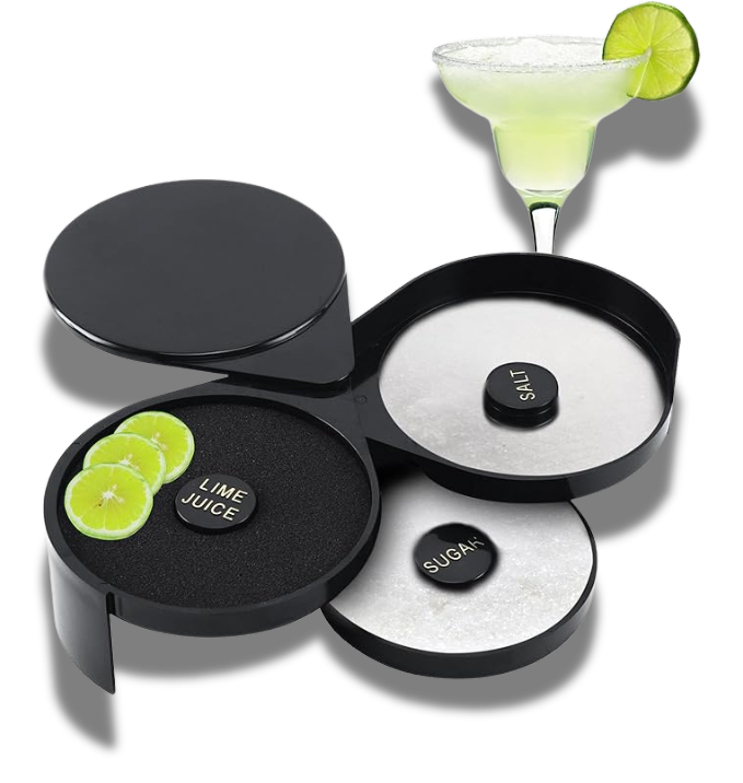 Características destacadas:Diseño funcional de 3 niveles: Cada nivel está diseñado para una tarea específica. Un compartimento para la esponja húmeda (jugo de limón o lima), un segundo para la sal y un tercero para el azúcar o cualquier otro ingrediente que desees usar para decorar tus copas.Material duradero: Fabricado con plástico de alta calidad, es resistente y fácil de limpiar. Su diseño compacto y plegable facilita su almacenamiento, ocupando poco espacio en tu bar o cocina.Perfecto para cualquier ocasión: Ideal para fiestas, reuniones, celebraciones o simplemente para disfrutar de una deliciosa margarita en casa. También es un regalo excelente para quienes aman la coctelería.Uso sencillo: Solo abre el kit, agrega los ingredientes en cada nivel y prepárate para impresionar a tus invitados con unos cócteles perfectamente decorados.