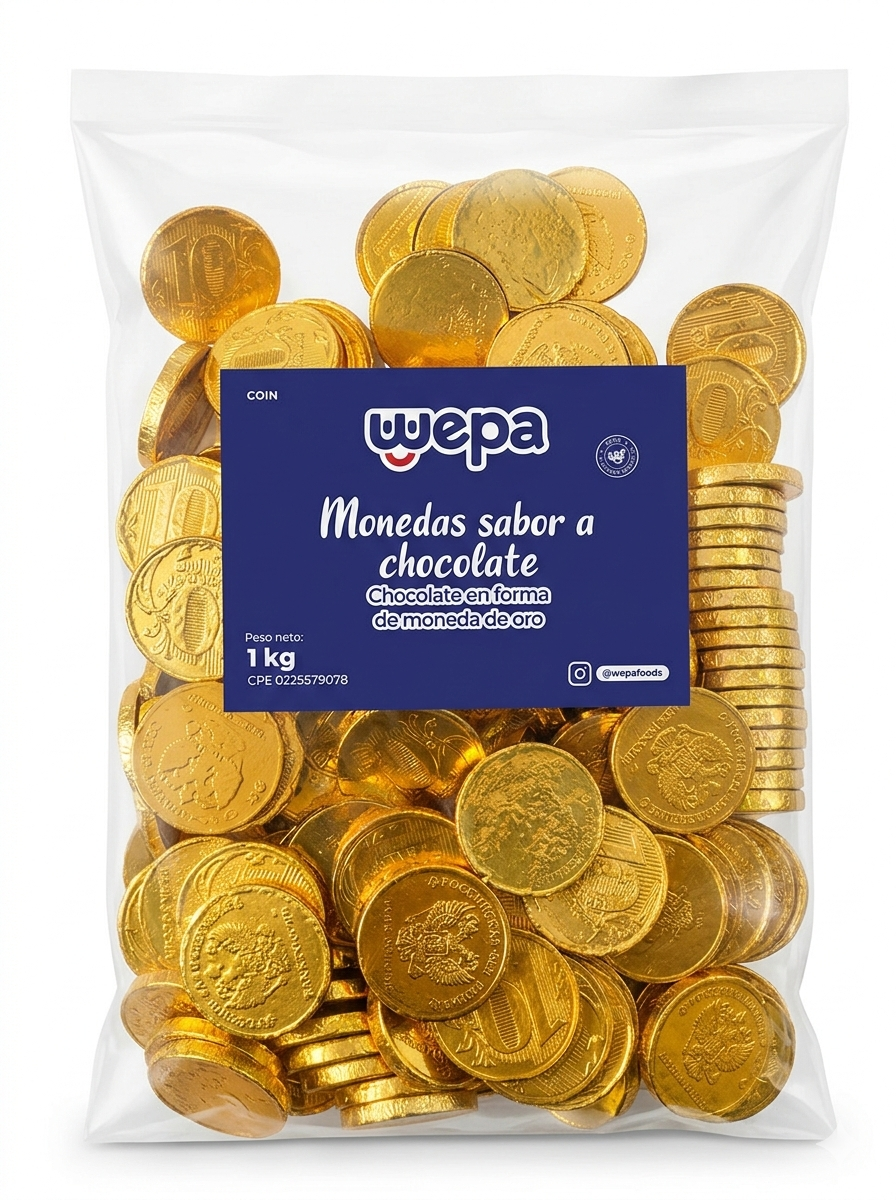 Añade un toque de brillo y dulzura a tus celebraciones con las Monedas de Chocolate Wepa. Este producto combina el encanto clásico de una moneda de oro con el delicioso sabor del chocolate, presentadas en un formato de 1kg, 500gr y 90gr ideal para eventos de gran escala, decoraciones temáticas o mesas de dulces.