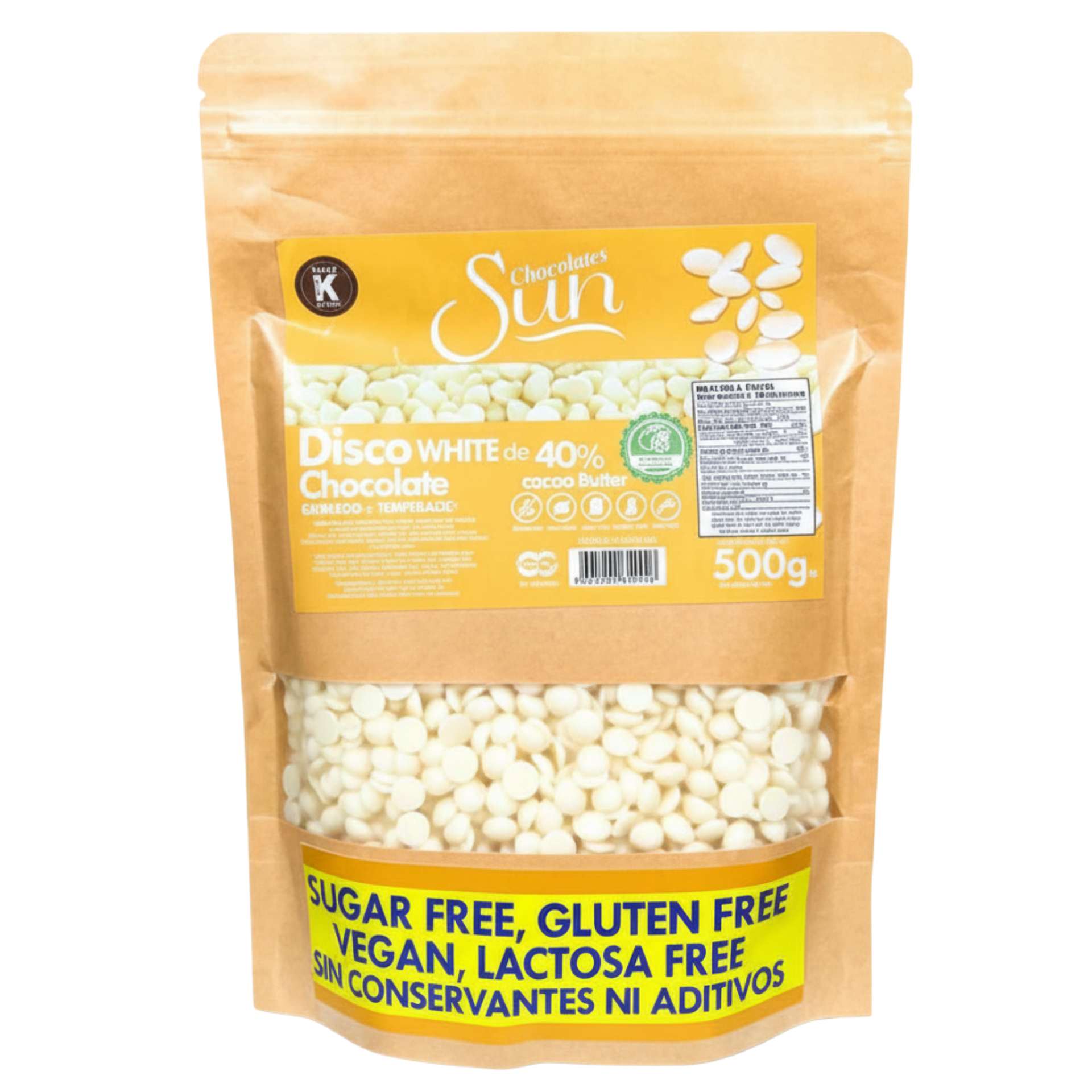 Este producto se presenta en forma de gotas o discos, ideal para derretir en repostería, usar como cobertura o simplemente disfrutar como snack. A diferencia del chocolate oscuro, el chocolate blanco no contiene sólidos de cacao (cacao en polvo), sino que se compone principalmente de manteca de cacao, lo que le confiere su textura cremosa y color pálido.En lugar de azúcar, estas gotas utilizan el Monkfruit como edulcorante principal, a menudo combinado con un alcohol de azúcar (como el Eritritol) para conseguir el volumen y la textura dulce. Al tener un contenido de cacao (40%) basado exclusivamente en la manteca de cacao, ofrece un sabor lácteo y dulce, pero con un bajo impacto glucémico.Ingredientes:Manteca de Cacao (40%).Sólidos Lácteos (o una alternativa vegetal para la versión vegana/sin lácteos).Edulcorantes: Eritritol y Extracto de Fruto del Monje (Monkfruit).Otros: Lecitina (emulsionante), extracto natural de vainilla.Certificaciones comunes: Sin Azúcar Añadido, Bajo en Carbohidratos Netos, apto para dieta Keto, a menudo Sin Gluten.