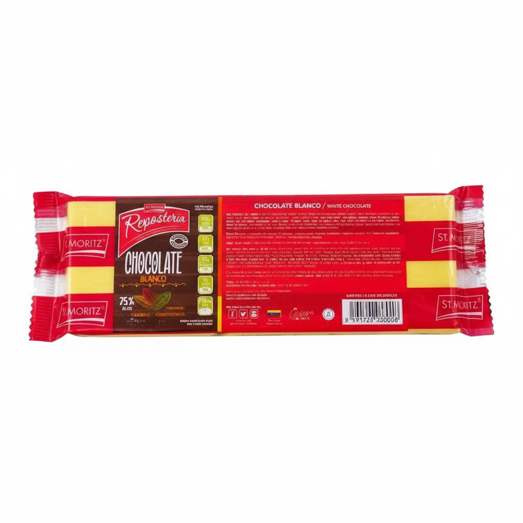 Da rienda suelta a tu creatividad en la cocina con la Tableta de Chocolate Blanco St. Moritz. Esta barra de 500g es el ingrediente ideal para quienes buscan un sabor dulce y cremoso, perfecto para derretir y usar en una amplia variedad de preparaciones.Su color neutro la convierte en el lienzo perfecto para añadir colorantes a base de grasa, permitiéndote crear decoraciones vibrantes y únicas para tus pasteles, galletas y cupcakes. Con su sabor delicado y su textura suave, esta tableta es un básico para cualquier repostero que valore la versatilidad y la calidad.Ingredientes:Azúcar, manteca de cacao, leche entera en polvo, lecitina de soya (emulsionante) y saborizante artificial (vainillina).Aviso de alérgenos: Contiene leche y soya. Puede contener trazas de maní y/o nueces de árbol.