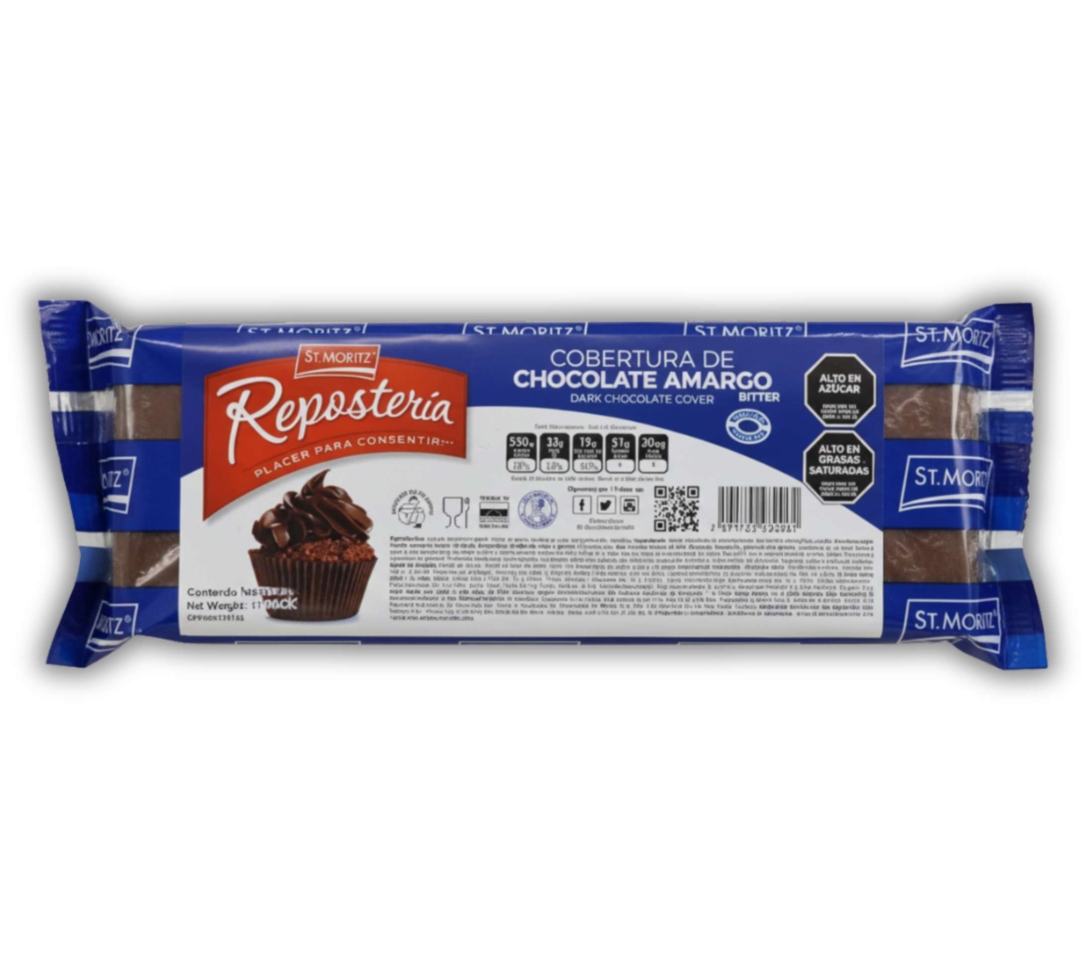 Consigue un acabado brillante y profesional en todas tus creaciones de repostería con la Tableta de Cobertura de Chocolate Bitter St. Moritz. Este chocolate está especialmente formulado para derretirse de manera uniforme y sin complicaciones, lo que lo hace ideal para bañar, glasear o moldear. Su intenso y rico sabor a cacao lo convierte en el ingrediente perfecto para ganaches, mousses, y cualquier receta que requiera un chocolate de alta calidad con un perfil amargo. El práctico formato de 500g es ideal para chefs y reposteros que buscan un producto confiable para su uso diario.Ingredientes:Azúcar, licor de cacao, manteca de cacao, cacao en polvo, emulsificante (lecitina de soya) y saborizante artificial (vainillina).Aviso de alérgenos: Contiene soya. Puede contener trazas de leche, maní y/o nueces de árbol.